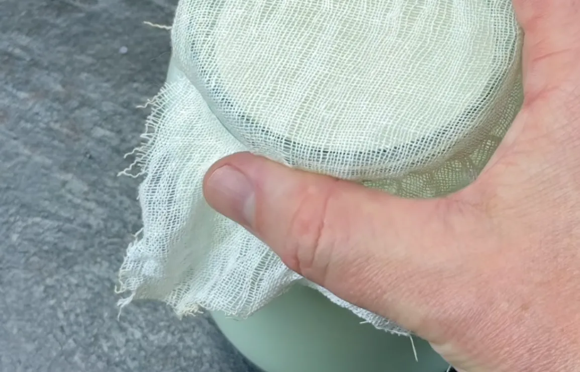 У банці змішую молоко зі сметаною, добре перемішую. Накриваю марлею і залишаю при кімнатній температурі приблизно на 1 добу, щоб маса добре скисла.